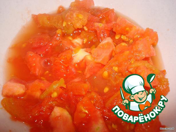 Помидоры положить в горячую воду и проварить пару минуток. Снять с них кожицу и нарезать кусочками.
