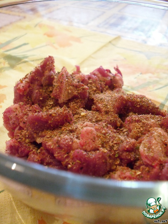 Мясо порезать на небольшие кусочки , засыпать готовой приправой для баранины , перемешать, накрыть плёнкой и оставить на 45 мин.- час.