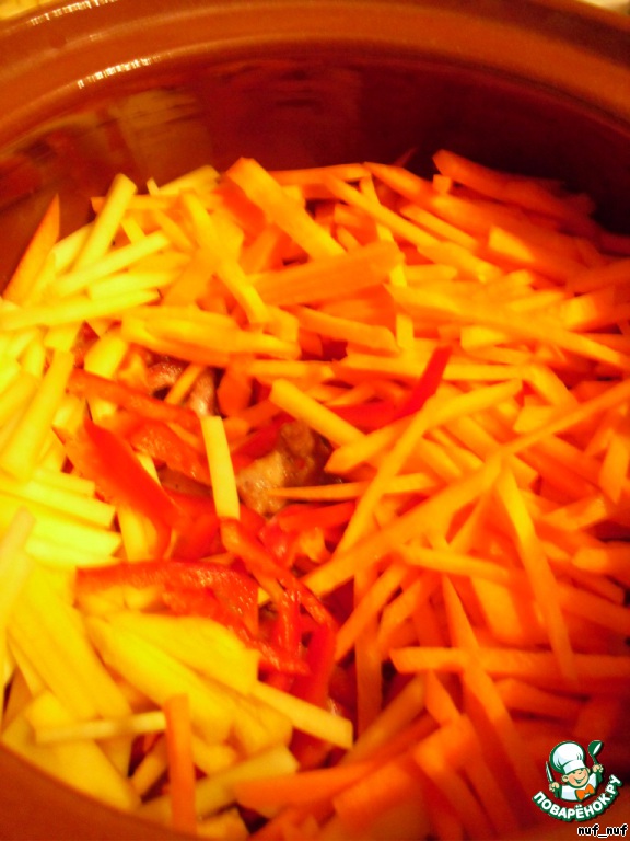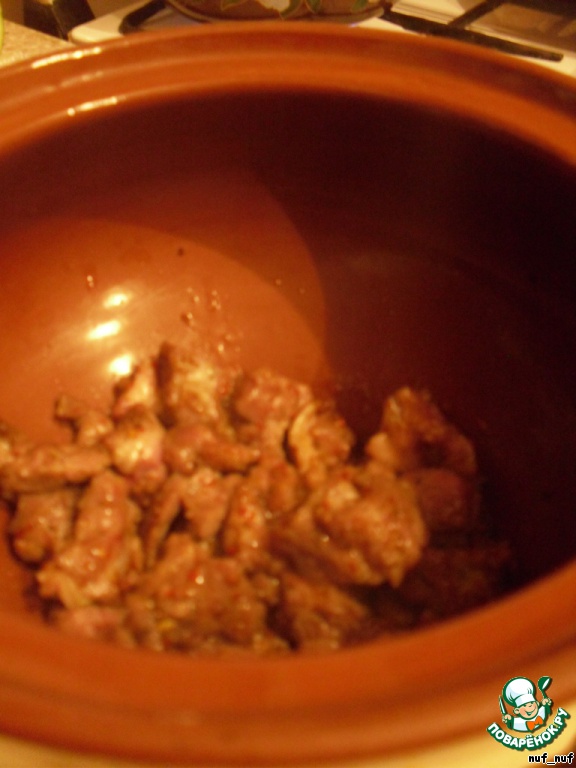 сложить мясо в горшок.( у меня он не последнего калибра - объёмом 2,5 литра)