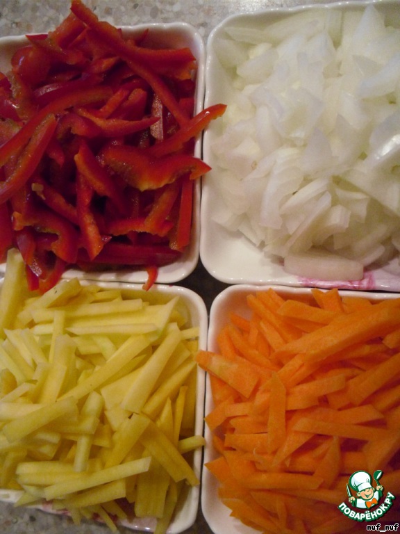 Овощи (тыкву (в оригинале - репу, но где же её найдёшь , ту репу), морковь , лук и сладкий перец) нарезать некрупно.