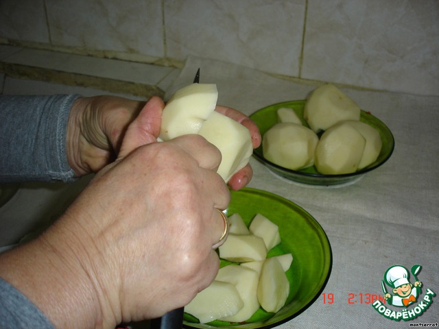 Картофель чистим и нарезаем по-старинному: надрезаем ножом часть картошки, а потом доламываем до конца с характерным звуком "крак". Так в бульон попадает больше крахмала.