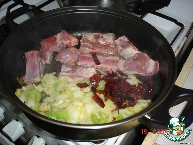 На дно широкой кастрюли наливаем рaст.масло, обжариваем нарезанный лук, чеснок, зеленый перец, косточки, мякоть красного перца.