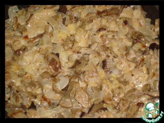Грибы мелко нарезаем и кладём на разогретую сковороду. После того, как испарится жидкость, добавляем сливочное масло и мелко нарезанный лук. Когда лук будет готов, добавляем сливки (сметану), тушим минут пять, солим, перчим и выключаем.