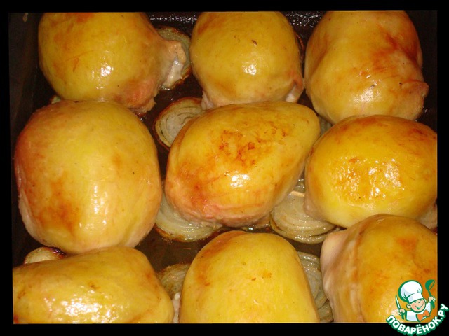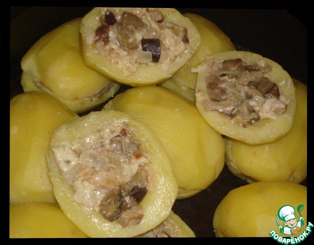| Картофель, фаршированный грибами и запечённый в куриной кожице. |