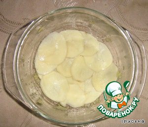 Огнеупорную посуду смазать выдавленным чесноком и налить в нее немного масла. Выложить на дно нарезанный тонкими ломтиками картофель.