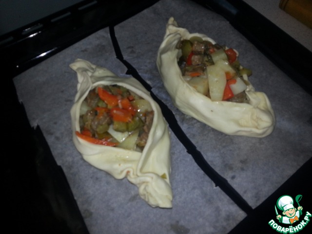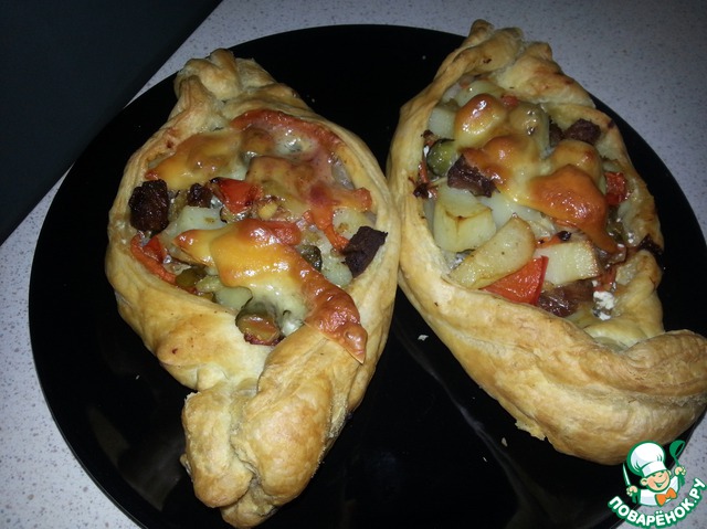 Раскатать тесто в прямоугольники-в центр выложить начинку-свернуть в лодочку. 200°С на 30минут потом добавить сыр и довести до готовности.
