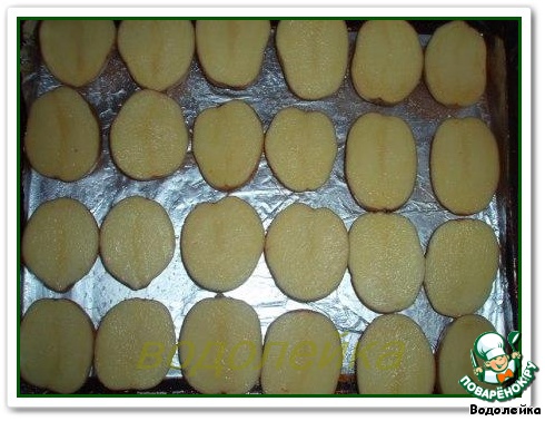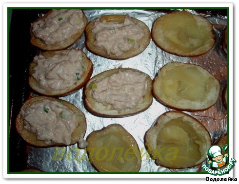На фото количество картошки больше, чем я указала в ингредиентах. Все очень просто - я поставила запекаться целый противень, а начинки у меня получилось только на 7 шт. картофеля (т. е. на 14 половинок). Остальную мы кушали не нафаршированную.