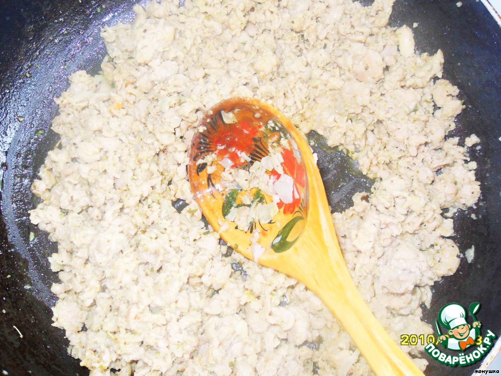 На сковороду наливаем растительное масло и тушим фарш, солим, перчим, добавляем мелко нарезанный лук.
