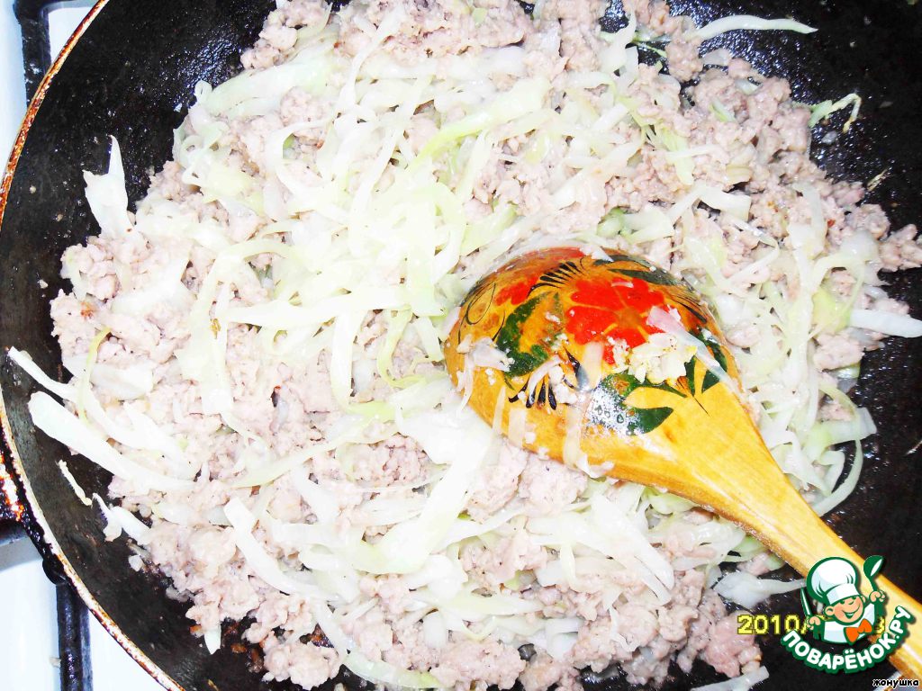 Как только фарш будет почти готов, мелко шинкуем капусту и добавляем к фаршу, перемешиваем и накрываем крышкой на 10 минут, снимаем крышку и еще 5 минут тушим на медленном огне)))
