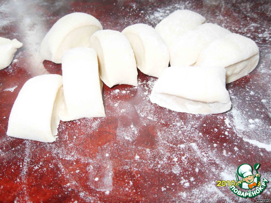 Тесто разрезаем на три части, каждую из которых скручиваем "колбаской" и режем на кусочки где-то по 5см. Каждый кусочек раскатываем тоненько.