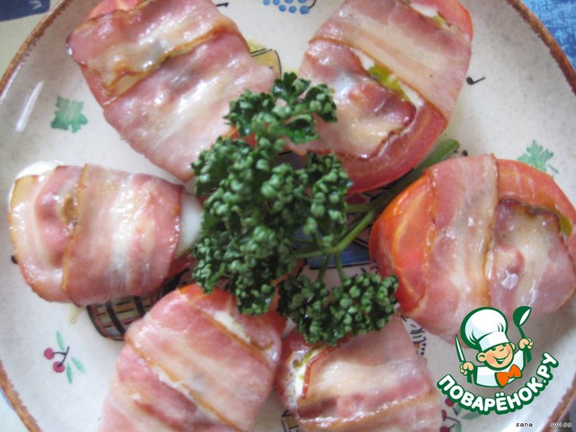 | Вкусная и быстрая закуска из помидоров, фаршированных моцареллой и соусом "песто", в "одежке" из бекона. Попробуйте! |
