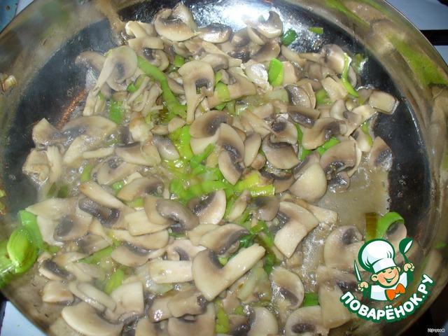 Грибы нарежьте, лук-порей нарежьте половинками колечек. Обжарьте грибы и порей на небольшом количестве масла.