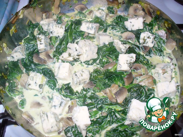 Когда они будут почти готовы, положите сверху замороженный шпинат и накройте сковороду крышкой.