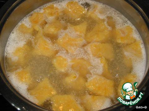 Тыкву порезать кубиками, переложить в кастрюльку, влить немного воды и потушить под крышкой на маленьком огне минут 10 (до мягкости),затем воду слить, а тыкву размять в пюре.