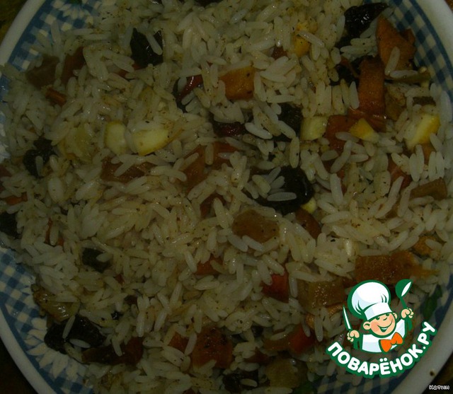 Сухофрукты режем не очень мелко. Добавляем орехи (если есть). У меня в данном случае не оказалось. Смешиваем с рисом и лимоном.