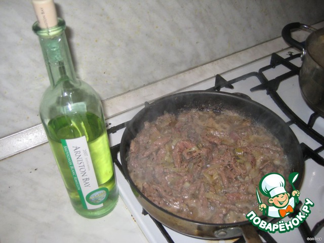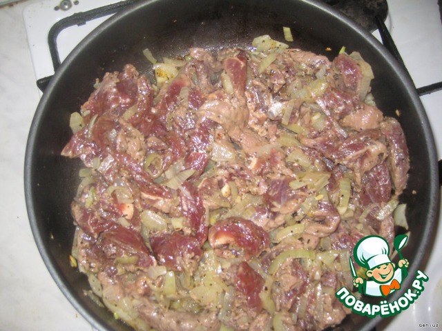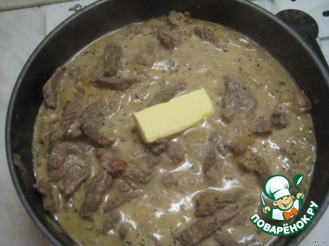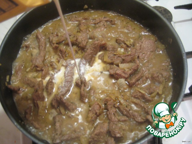 Мясо режем тоненькими полосками (как для бефстроганов).