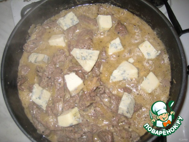 сыр дор блю режем кусочками, добавляем в соус, помешиваем, пока сыр на растворится в соусе.