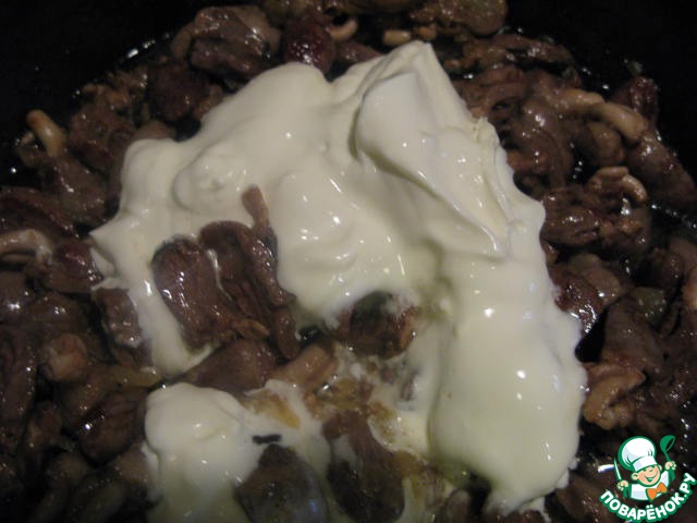 Обжаривать сердечки с луком до светло-коричневого цвета.