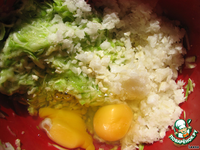 Сок хорошо отжимаем. Добавляем яйца, измельченные лук и чеснок.