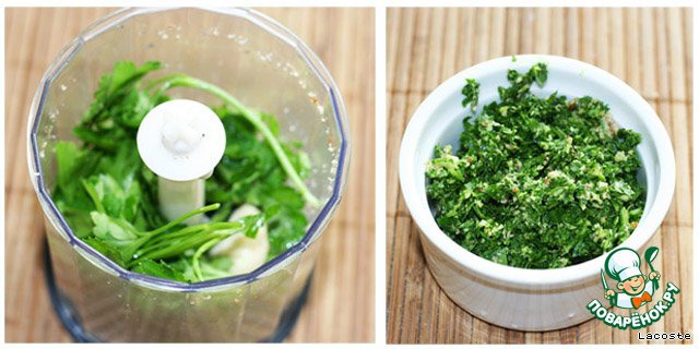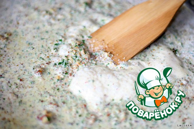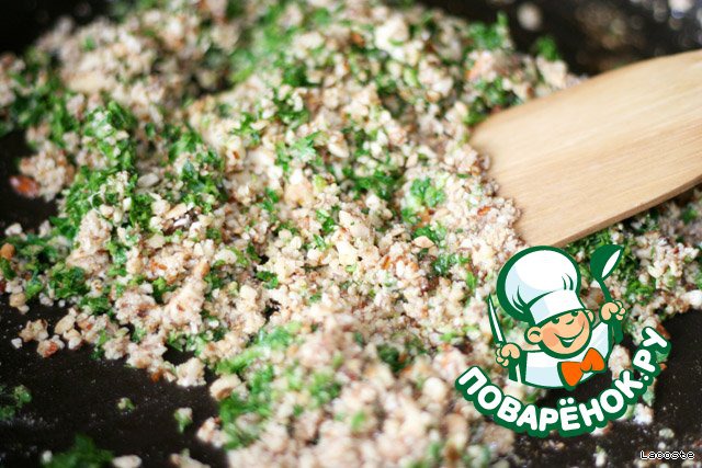 Обжарить орехи и зелень на разогретом оливковом масле, 2мин.
