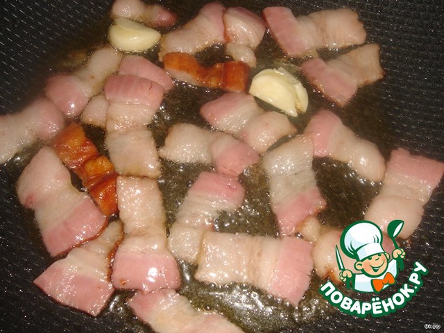 В глубокой сковороде нагреть оливковое масло, добавить зубчики чеснока целиком, не измельчая, можно лишь предварительно слегка раздавить зубчики широкой стороной лезвия ножа, чтобы они лучше отдали свой вкус маслу.