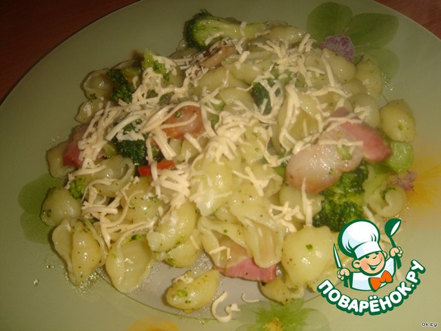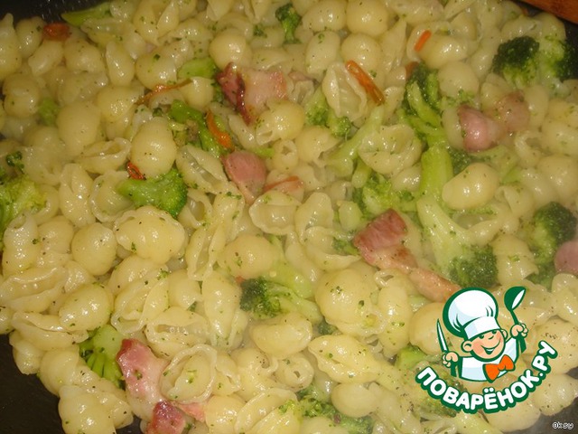| Очередной блиц-рецепт, найденный у Юлии Высоцкой. Я жутко не хотела готовить ужин, просто не было желания ни готовить, ни кушать, только осознание того, что с минуты на минуту вернется с работы голодный муж, заставило меня отправиться на кухню. К моему удивлению, всего за 15 минут получился такой отличный ужин... даже аппетит разыгрался! И мужу очень понравилось сочетание макарон-ракушек с брокколи, беконом и сыром. Ну очень вкусно! |