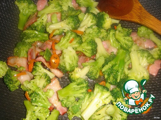 Добавить перец и брокколи.Посолить и поперчить по вкусу. Протушить 5-7 минут на медленном огне.