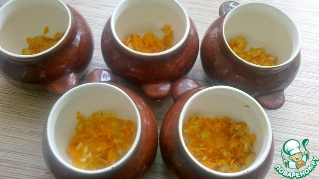 Помоем шампиньоны. Мелко нарежем. Обжарим и потушим, посолим. Выложим в горшочки сверху овощей.