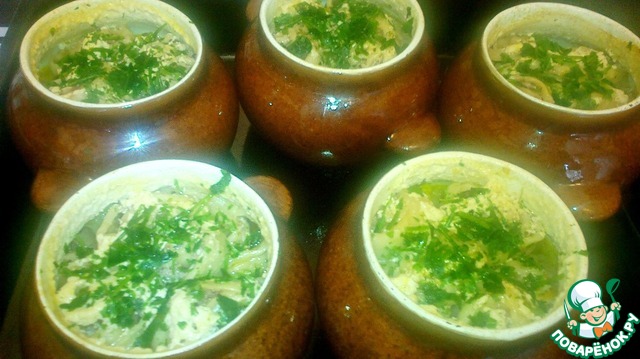 Мясной бульон ( у меня уже соленый) смешиваем с пакетом сметаны и заполняем горшочки. Можно и без бульона. Воду смешать со сметаной.