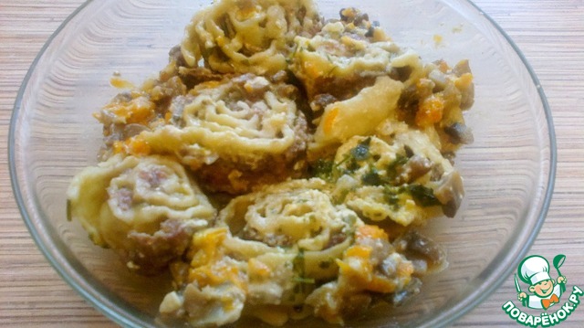 Приготовим пельменное тесто из 2-х яиц, 150мл воды, соли и муки. Фарш смешаем с солью и перцем. Раскатаем тонкий пласт теста. На тесто тонким слоем выложим фарш. Фарш посыплем мелко нарезанной зеленью лука и укропа.