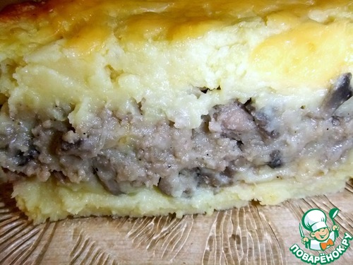В форму выложить половину картофельной массы. Затем фарш.