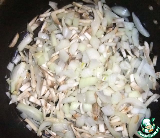 На растительном масле обжарить лук. Добавить грибы, тушить 5 минут.