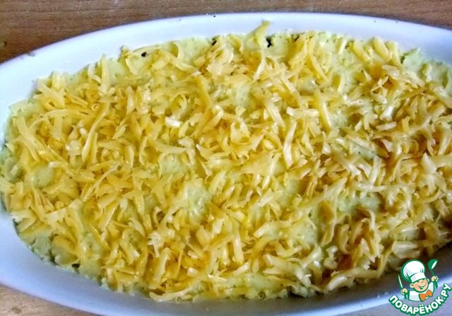 Приготовить картофельное пюре: слить воду, измельчить картофель, добавить яйцо и сливочное масло. Затем натереть на терке сыр и вмешать в пюре половину тертого сыра.