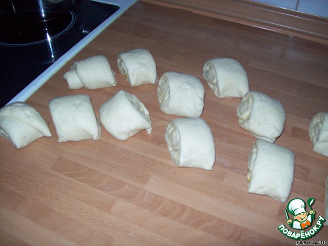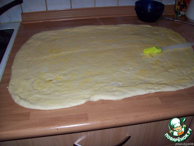 Пласт смазываем растопленным маргарином или сливочным маслом, сворачиваем в рулет и нарезаем на кусочки см по 5.