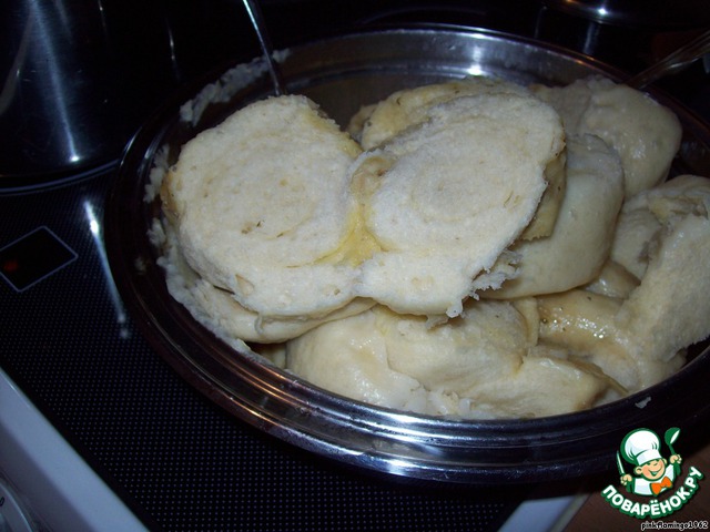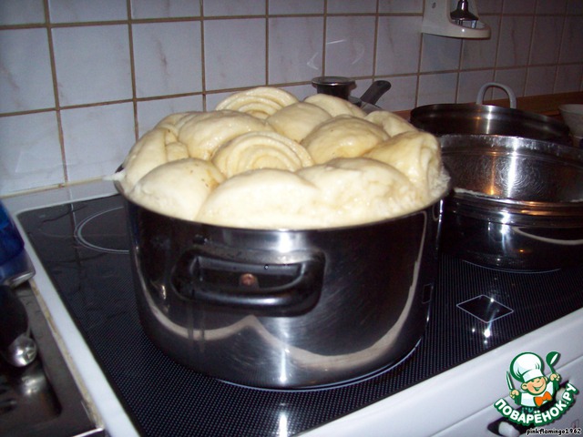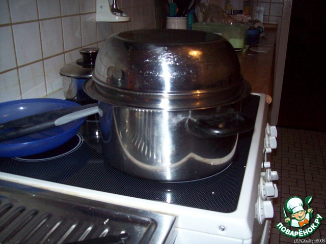 Теперь нужно накрыть кастрюлю крышкой, но нужно учитывать, что во время варки штрудели очень сильно увеличатся в размере и им нужно будет место, поэтому и нужна высокая кастрюля. Я взяла сегодня не очень высокую, но у меня есть чашка, которая как раз подходит к этой кастрюле по диаметру, вот ею я и накрыла кастрюлю. Чашка, естественно, стальная.