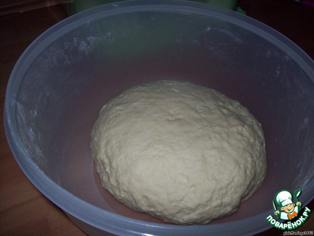 А вот и тесто готово. Выкладываем тесто из чашки на подпылeнную мукой рабочую поверхность стола
