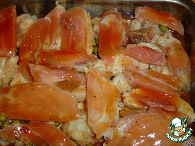 Сверху засыпаем зеленым горошком, а затем обжаренным на сливочном масле луком. Добавляем овощной бульон, который у нас остался после варки цветной капусты (150 г).