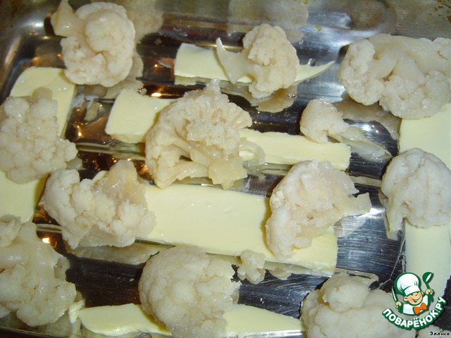 На противень выкладываем сливочное масло, а сверху - заранее отваренную цветную капусту.