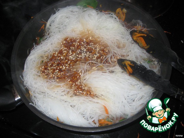 Залить лапшу горячей водой и дать постоять 10 минут. В этот раз я использовала тонкую лапшу и хватает ее только замочить. Если вы используете потолще, то после замочки надо ее еще отварить в кипяшей воде минуты 3-4.