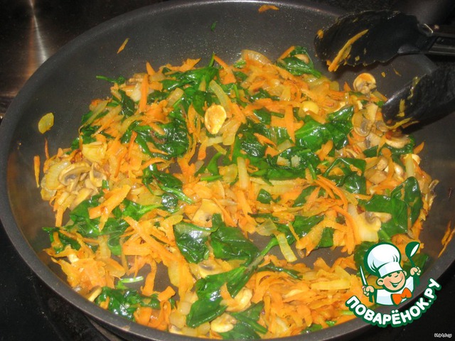 На большой сковороде, разогреть 1 ст.л. кунжутного масла. Жарить на нем лук, морковь, грибы -5 минут. Добавить шпинат и еще 3 минуты (не пугайтесь, что его много. Он сильно уменьшится в обьеме).