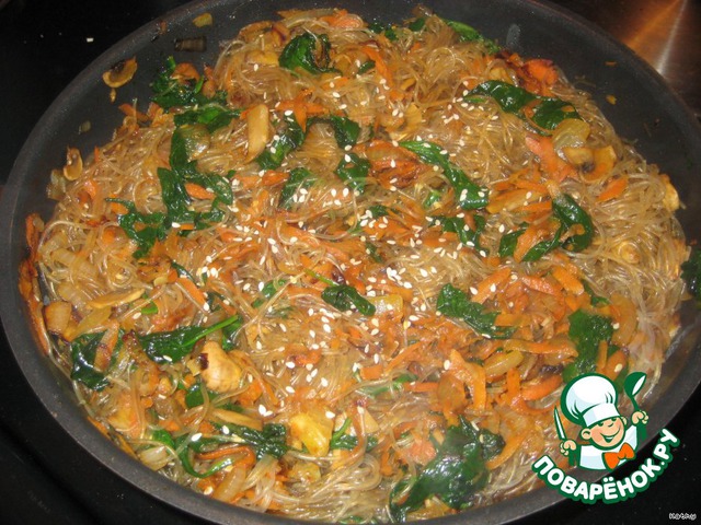 | Это одно из моих самых любимых Корейских блюд. Часто заказывали его в рестаранах и я очень хотела найти рецепт не уснупаюший по вкусу. Ето именно он. От лапшы в рестраранах вообше не отличить:). Теперь готовлю чапчей исклучительно дома и все, кто его пробовал просто в восторге. Блюдо принято есть холодным, или при комнатной температуре, а мне нравится теплым :-). Это самый класический рецепт, а вы сами можете подстраивать себе по вкусу. |