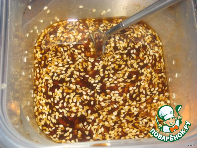 Смешать соевый соус, кунжутное масло (оно обязательно должно быть именно кунжутным), сахарный песок, чеснок, кунжут, перец (я предпочитаю очень острый чапчей, а вы кладите по вкусу)