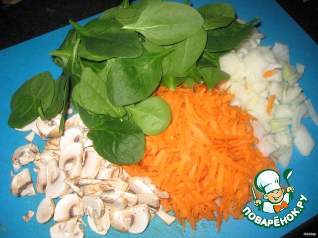 Нарезать лук, грибы, натереть морковь, всполоснуть шпинат (если используете). Мне нравится больше с ним, но некоторые предпочитают его не использовать в блюде.