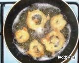 Лук обвалять в муке, обмакнуть в кляр и обжарить в большом количестве растительного масла.
