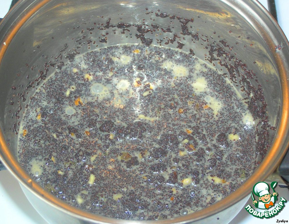 В мак добавить мед, сахар, изюм, грецкие орехи (порубить ножом), сливочное масло, проварить ещё 5-7 минут. Начинка готова, остудить.