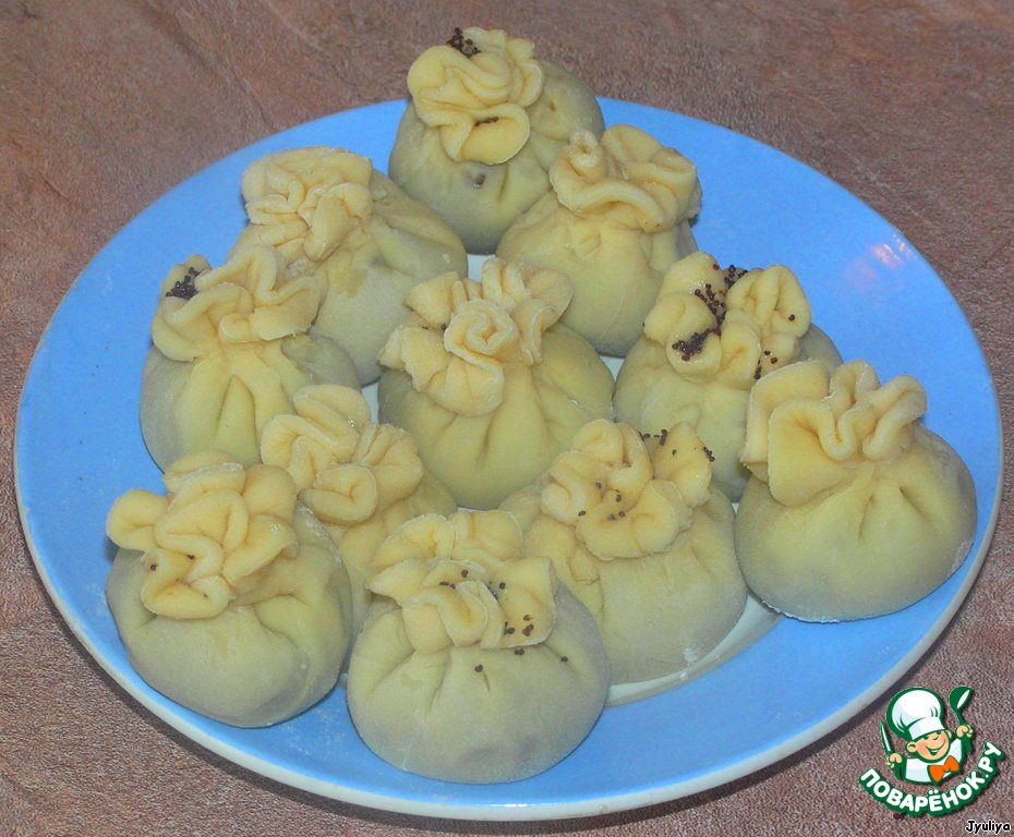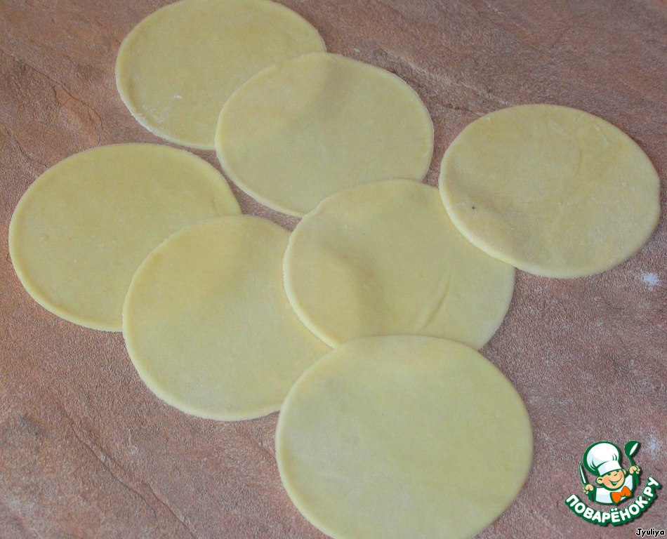 На середину кружка положить начинку, тесто слепите над начинкой, формируя мешочек. Отварить в кипящей воде до готовности.