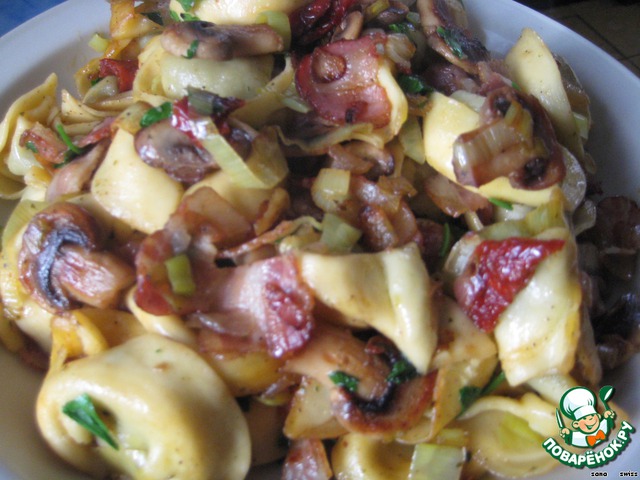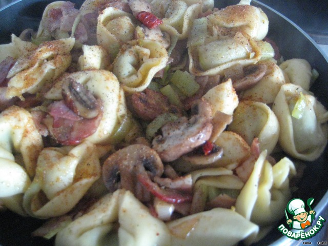Добавим кусочки вяленых томатов и отваренные (можно заранее) тортеллини, равиоли или вареники; обжарим все вместе, поперчим.