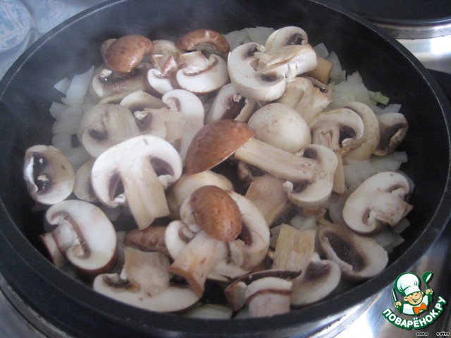 Очищеные и вымытые репчатый лук и грибы нарезаем (лук - мелко; грибы - крупно) и обжариваем в разогретой сковороде на растительном масле около 7-10 минут.
