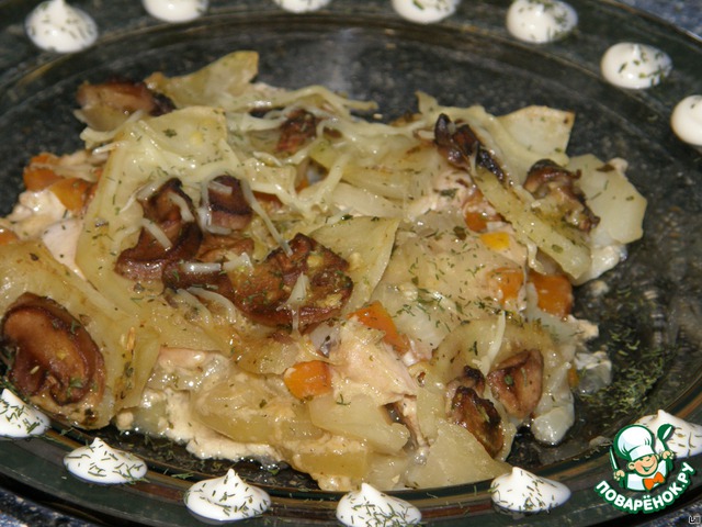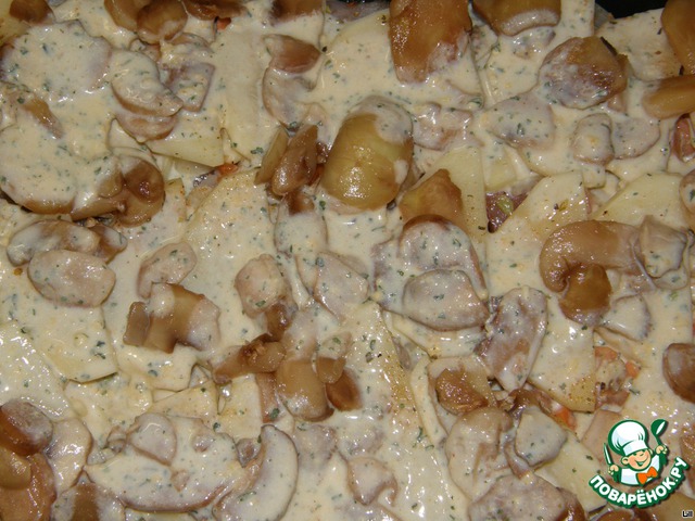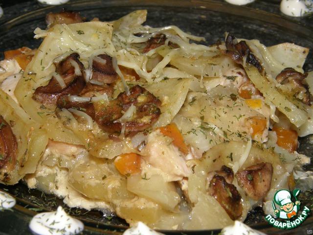 | Ароматное блюдо из картофеля с сочной курочкой и грибочками под сливочно-пряным соусом. |
