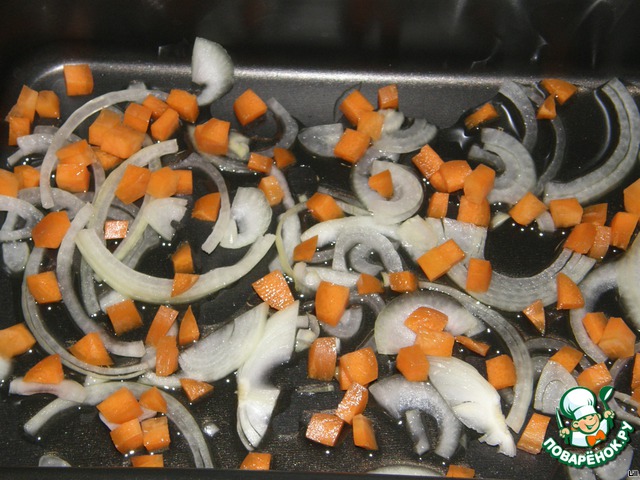 На дно формы для запекания наливаем растительное масло, слегка посыпаем специями, выкладываем нарезанные полукольцами лук и нарезанную кубиками морковь.
